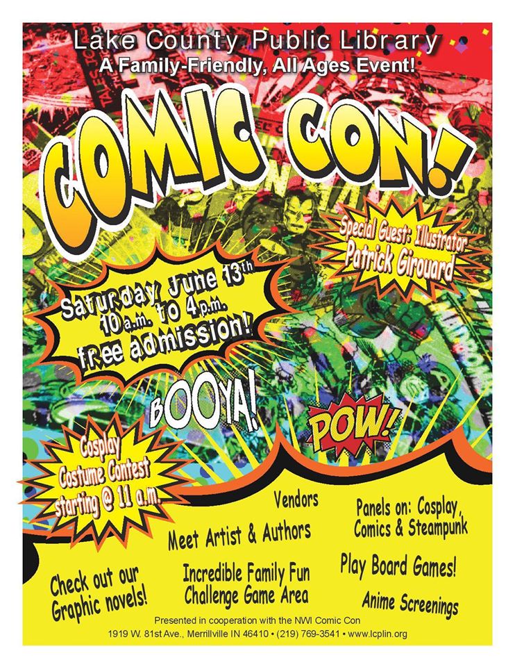 The Second event is the first ever Lake County Public Library Comic Con at the Merrillvile branch (1919 W. 81st Ave. Merrillville,IN 46410). This event starts at 10am and is free to the public. The con will feature various comic and art talents such as Ben Miller (Judges), Leslie Mason, myself, and many others. You can view the flyer for this event below.