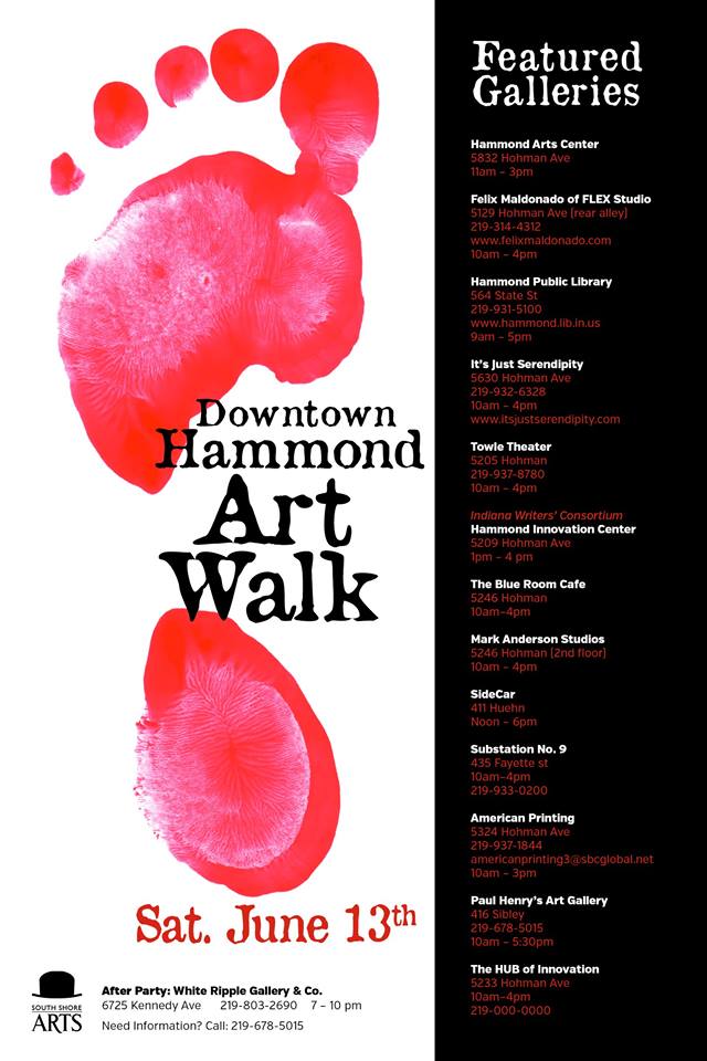 There will be four amazing event happening in Northwest Indiana this Saturday (June 13th) and my artwork will be featured in all of them. The city of Hammond will have their annual art walk starting at 10am till 4pm. One of the stops on this walking tour will be Paul Henry’s Art Gallery. The gallery’s current exhibit is Giant Monsters: A Catalog of Fears which three of my pieces are a part of. You can see a flyer for the walk below.