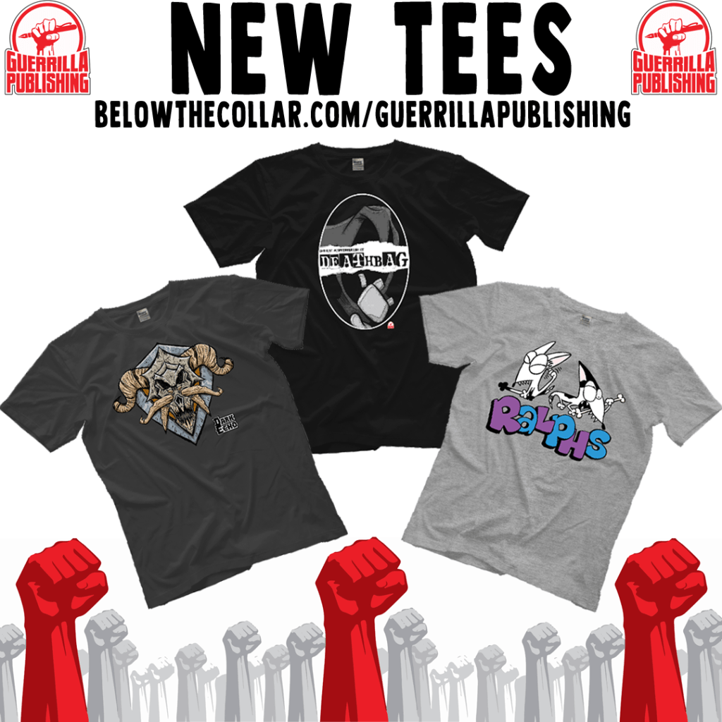 New tees from Adam Farster for Dark Echo, Ashley Esper for the Ralph’s, and a new Deathbag tee (God Save Deathbag) are available now at https://www.belowthecollar.com/guerrillapublishing You can also find tees for other Guerrilla Publishing titles I have worked out there.