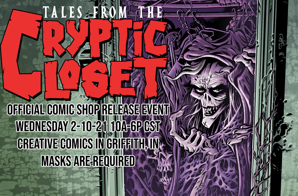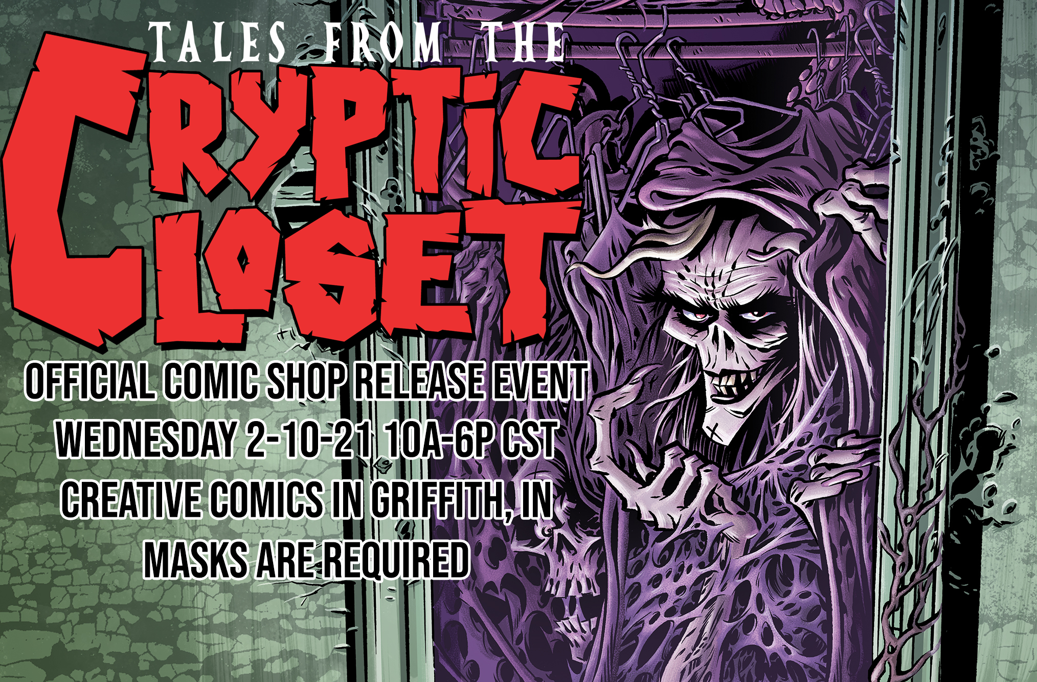 Tomorrow at Creative Comics in Griffith,In from 10a-6p CST. I will be selling and celebrating the official comic shop release (Chicagoland and NWI) of Tales from the Cryptic Closet #2. I will have copies of this book along with copies of issue 1, Cryptic Creeper Plush, and stickers available for purchase. Masks are required for the shop and will be allowing only 5 customers in at a time.