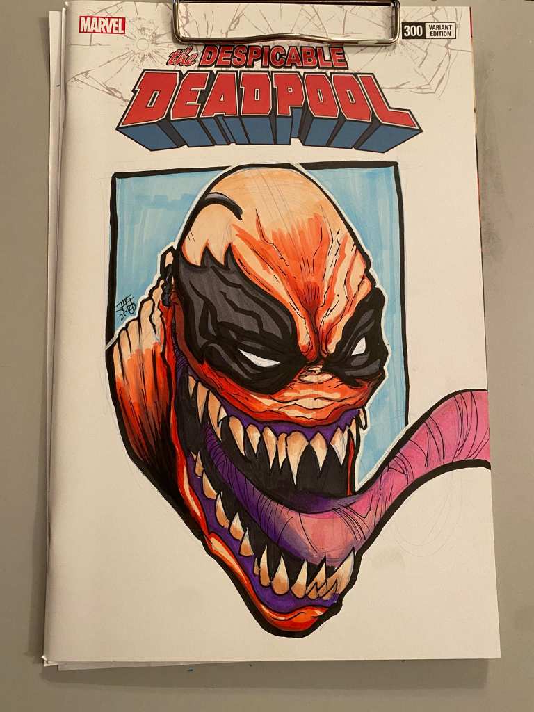 Venompool illustration on The Despicable Deadpool issue 300 blank cover. Created using photo blue pencil, copic markers, and pentel brush pen. Message for more information if interested in purchasing.