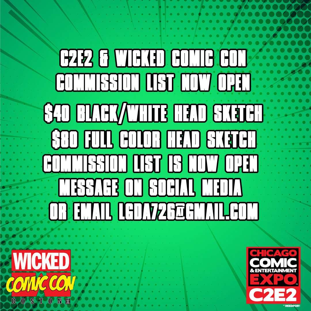 Commission List Open! Headed to C2E2 or Wicked Comic Con Boston? Secure your custom artwork now! Black & White Headshot – $40 Full-Color Headshot – $80 DM, comment, or email to claim your spot! Share this:TweetLike Loading... Related Leave a comment Cancel reply Δ