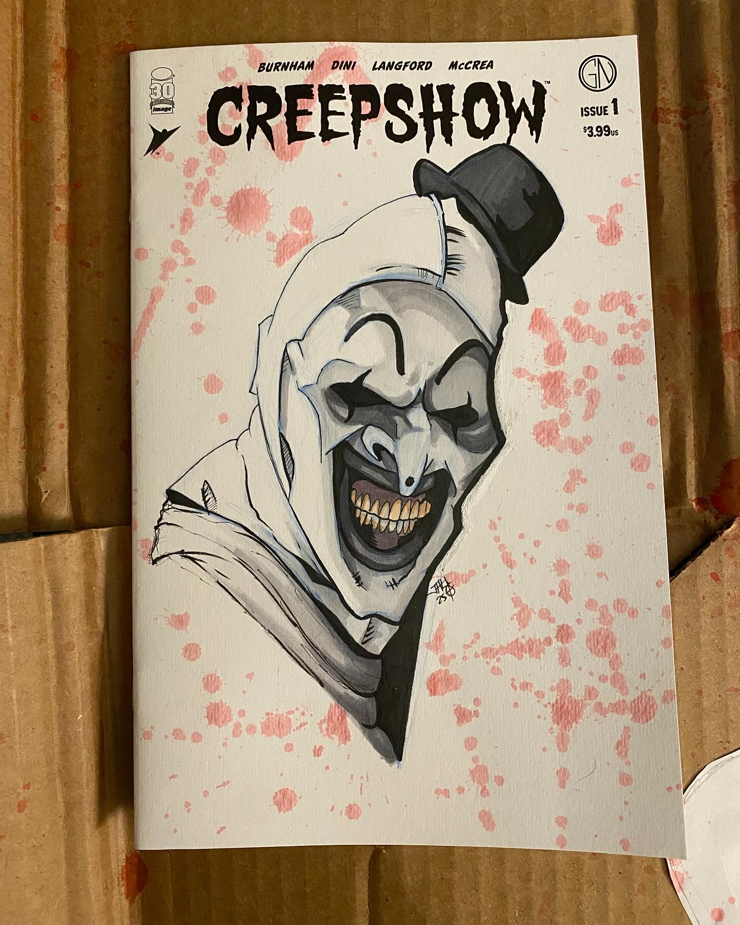My Art the Clown illustration on Image Comics’ Creepshow #1 — an original hand-drawn piece created using blue line pencil, Copic markers, liners, and a Pentel brush pen.