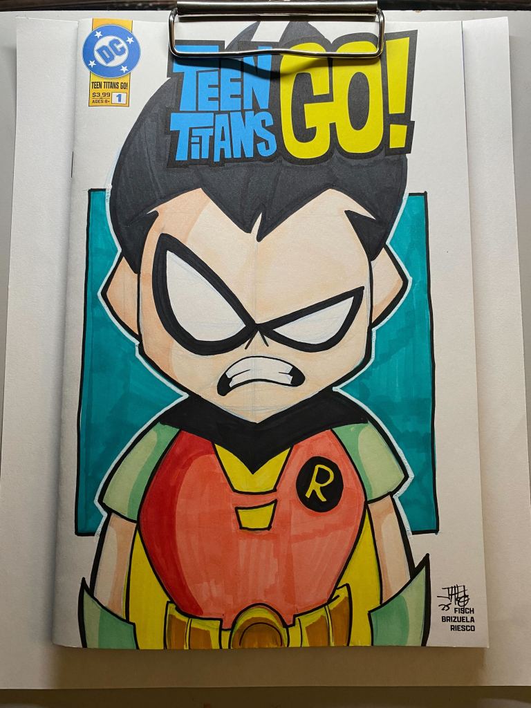 This copy of Teen Titans Go! Issue #1 features a hand-drawn sketch of Robin, created directly on the cover. The original artwork comes with a Certificate of Authenticity (COA), making it a unique collectible for fans and collectors alike.