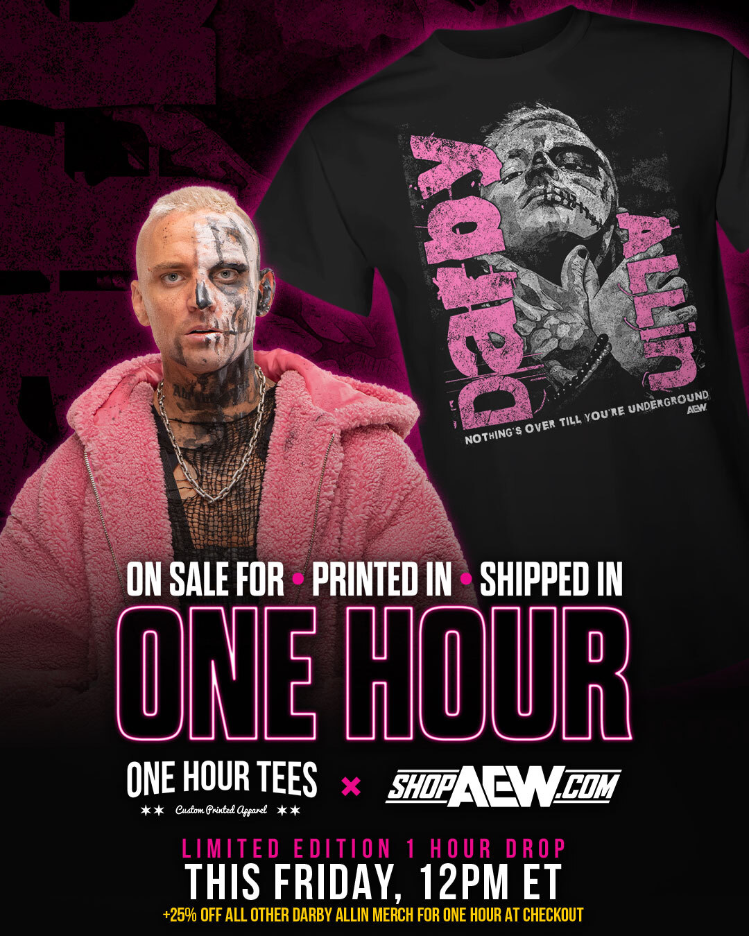 This Friday, July 18th, head over to ProWrestlingTees.com or ShopAEW.com to grab the Darby Allin “One Hour” Special Edition Shirt—designed and illustrated by me!