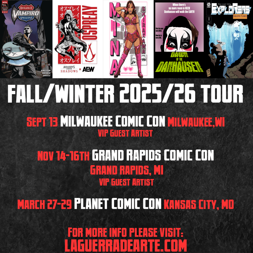 I’m hitting the road again this fall for a new round of comic con appearances! I’m honored to return as a VIP Guest Artist at the following shows: