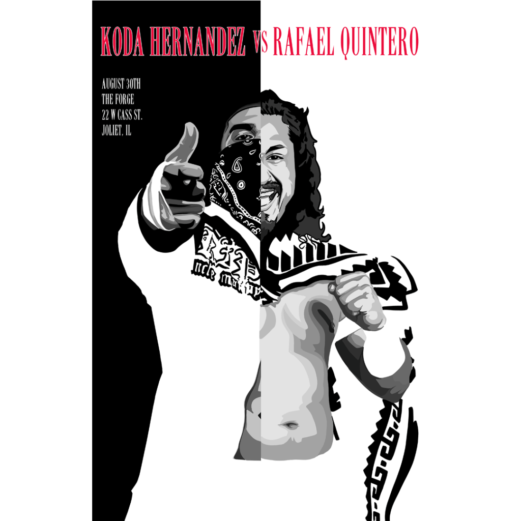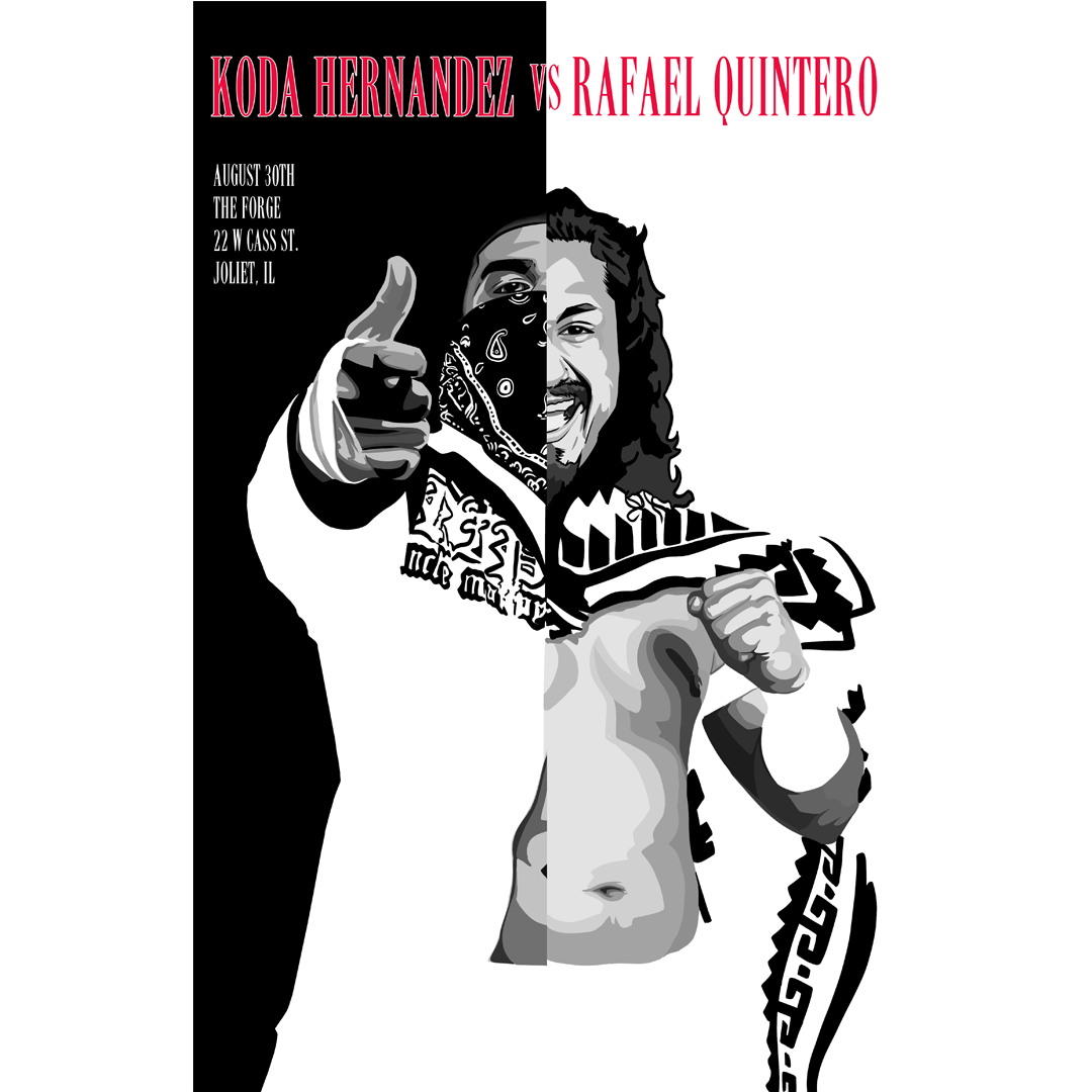 Inspired by the legendary Scarface movie poster, this bold new design captures the intensity of Koda Hernandez vs Rafael Quintero for EGO Pro Wrestling. See the full illustration and witness the match live Saturday, August 30 at The Forge in Joliet, IL.