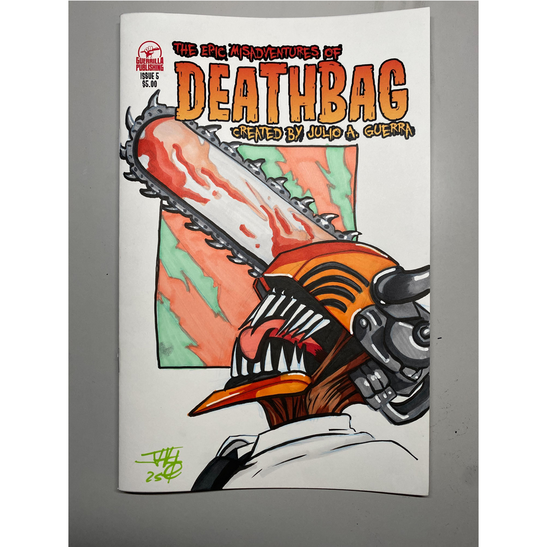 Now available for purchase a one of one original sketch of Chainsaw Man. Sketch is done on Guerrilla Publishing’s The Epic Misadventures of Deathbag issue 5 blank cover. The sketch is hand drawn using blue drafters pencil, copic markers, sharpie markers, paint makers, and pentel brush pen. If interested please send me a message via the contact page.